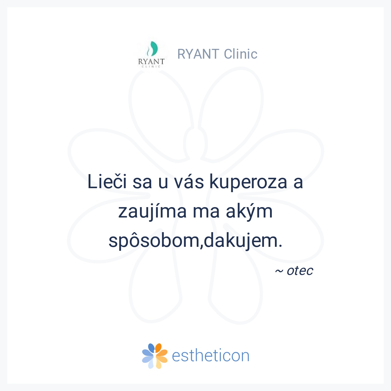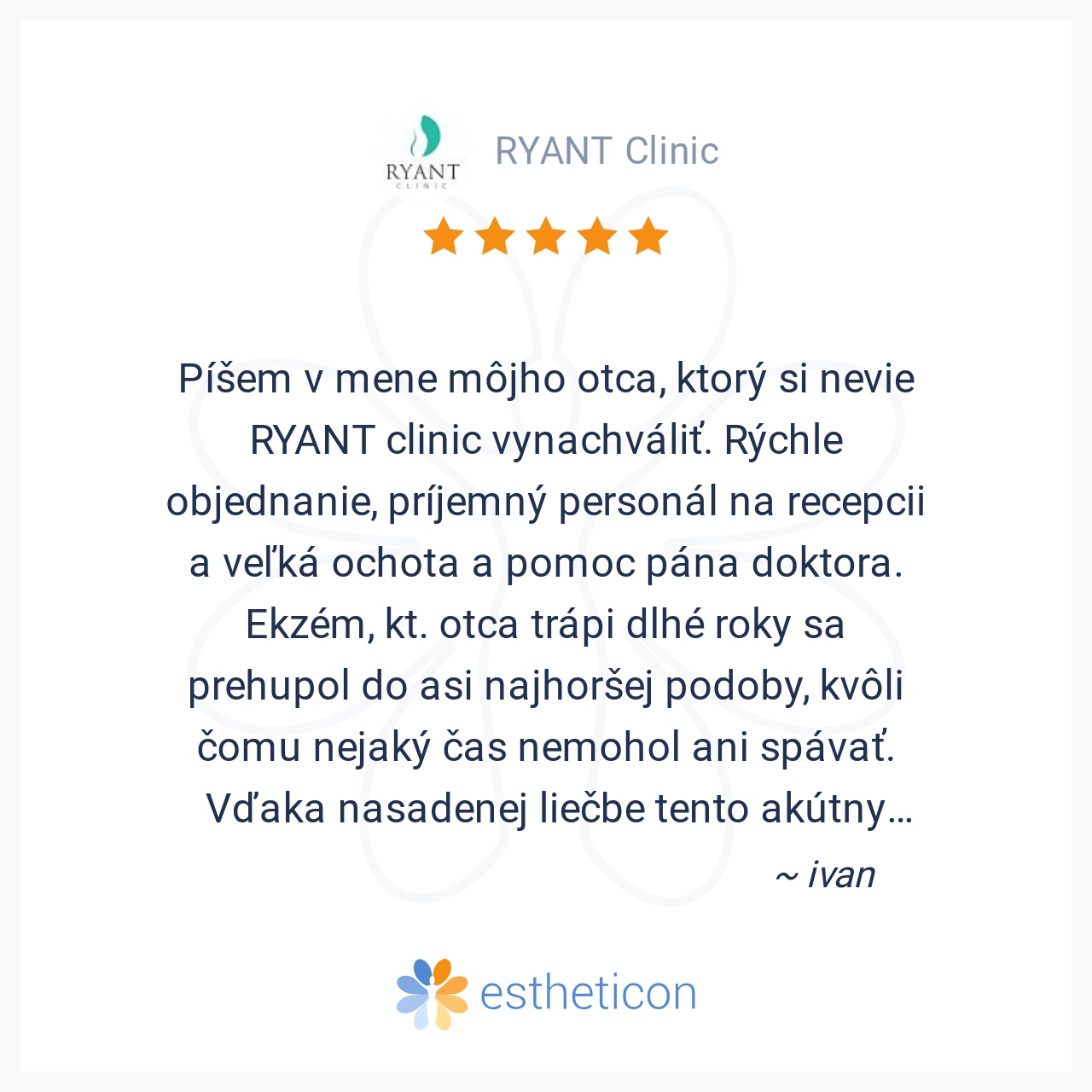 Píšem v mene môjho otca, ktorý si nevie RYANT clinic vynachváliť. Rýchle objednanie, príjemný personál na recepcii a veľká ochota a pomoc pána doktora. Ekzém, kt. otca trápi dlhé roky sa prehupol do asi najhoršej podoby,... Viac