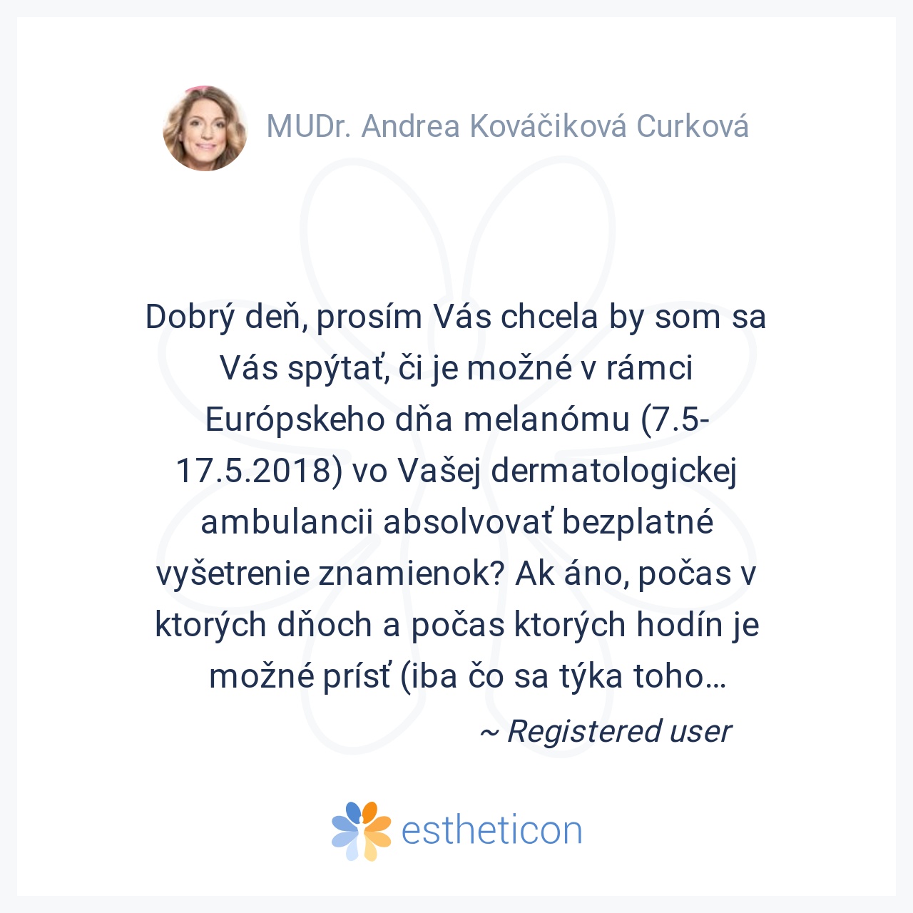 Dobrý deň, prosím Vás chcela by som sa Vás spýtať, či je možné v rámci Európskeho dňa melanómu (7.5-17.5.2018) vo Vašej dermatologickej ambulancii absolvovať bezplatné vyšetrenie znamienok? Ak áno, počas v ktorých dňoch ... Viac