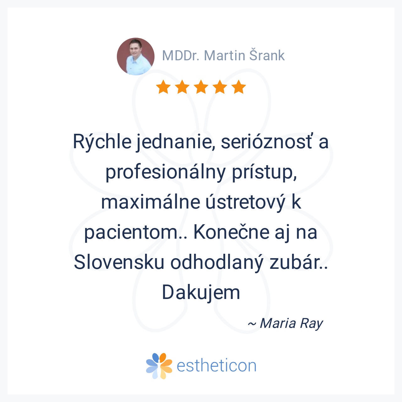 Rýchle jednanie, serióznosť a profesionálny prístup, maximálne ústretový k pacientom.. Konečne aj na Slovensku odhodlaný zubár.. Dakujem