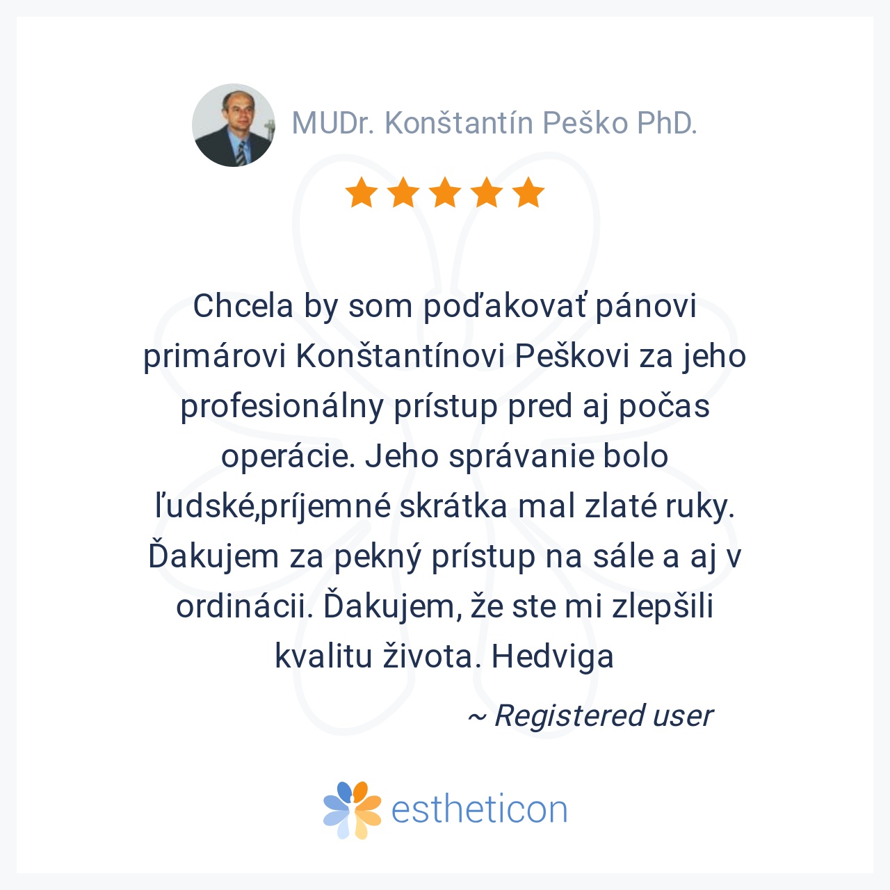 Máte osobnú skúsenosť s MUDr. Konštantín Peško PhD.? Pomôžte záujemcom a napíšte o tom.