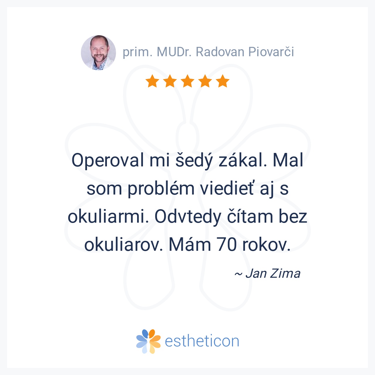 Absolvoval som operáciu šedého zákalu a výmenu šošoviek. Nemalo to chybu. Ústretový a profesionálny prístup personálu - pán primár Piovarči a pani doktorka Belinská. Som spokojný, lebo vidím, čo som nevidel. Vďaka.