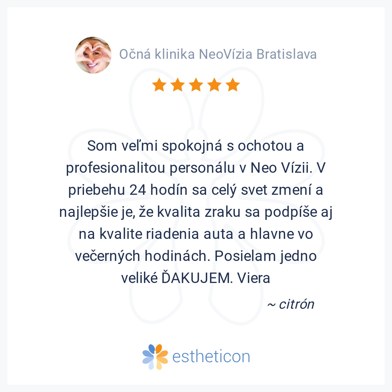 Po vyšetreniach na klinike NeoVízia mi pani doktorka Smorádková povedala ,že vidím len na 5 percent.Po konztultácii mi odporučila operáciu metódou PRELEX.Operoval ma pán primár Piovarči.Som po operácii viac ako tri mesia... Viac