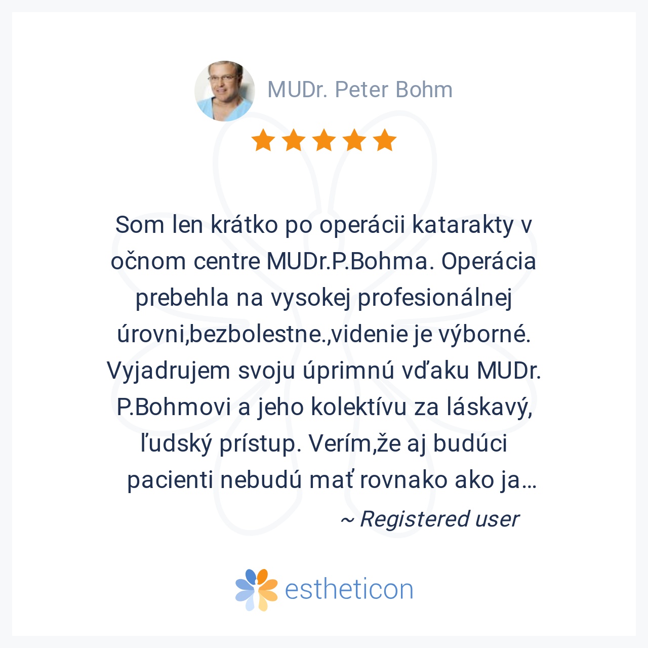 Som len krátko po operácii katarakty v očnom centre MUDr.P.Bohma. Operácia prebehla na vysokej profesionálnej úrovni,bezbolestne.,videnie je výborné. Vyjadrujem svoju úprimnú vďaku MUDr. P.Bohmovi a jeho kolektívu za ... Viac