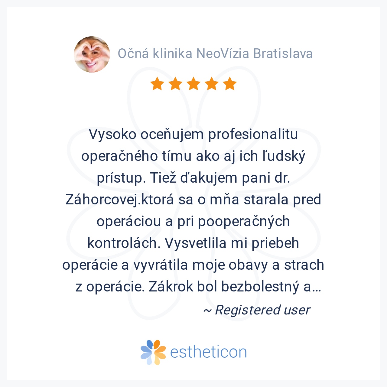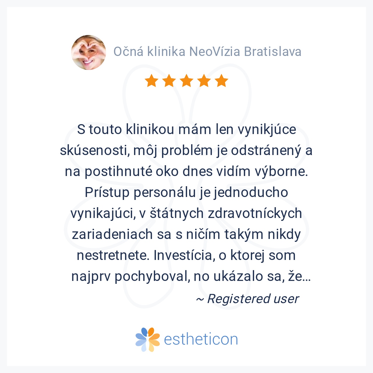 Očnú kliniku Neovízia hodnotím ako najlepšiu na území SR. zmenili mi život a pohľad na svet o 180 stupňov, perfektný kolektív lekárov a sestričiek.