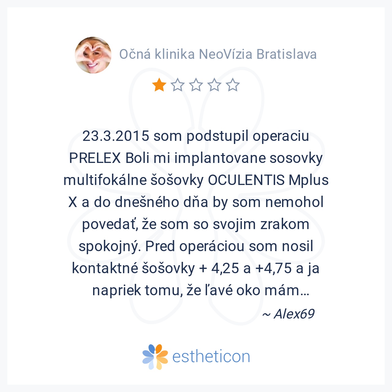 23.3.2015 som podstupil operaciu PRELEX Boli mi implantovane sosovky multifokálne šošovky OCULENTIS Mplus X a do dnešného dňa by som nemohol povedať, že som so svojim zrakom spokojný. Pred operáciou som nosil kontaktné š... Viac