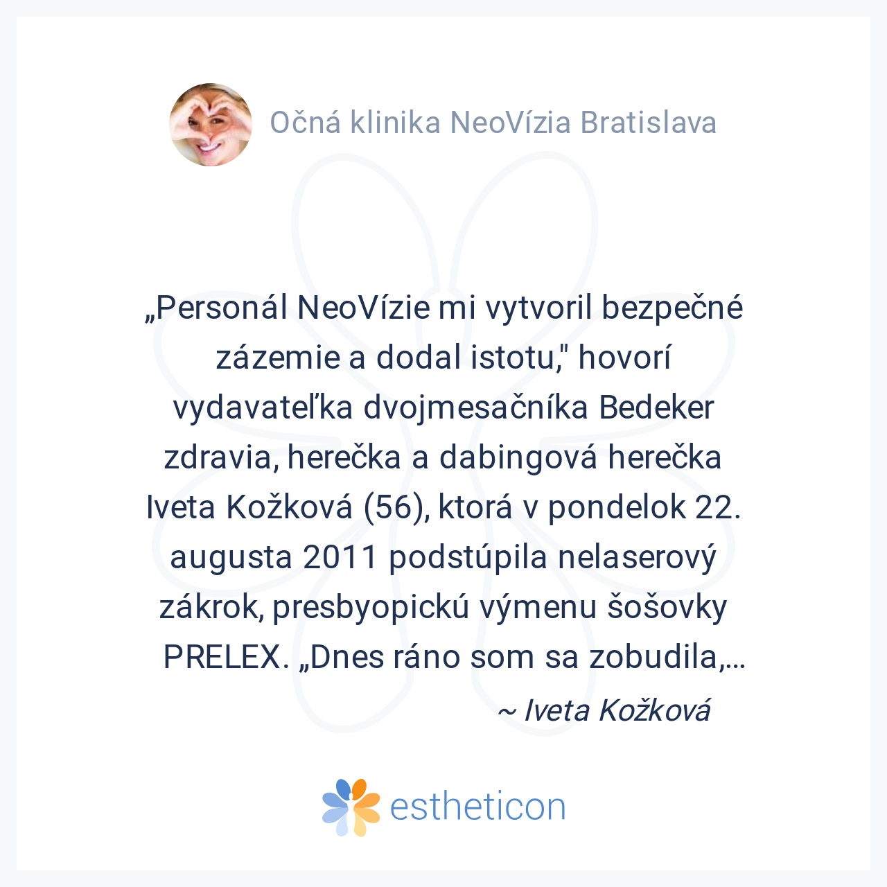 „Personál NeoVízie mi vytvoril bezpečné zázemie a dodal istotu," hovorí vydavateľka dvojmesačníka Bedeker zdravia, herečka a dabingová herečka Iveta Kožková (56), ktorá v pondelok 22. augusta 2011 podstúpila nelaserový z... Viac