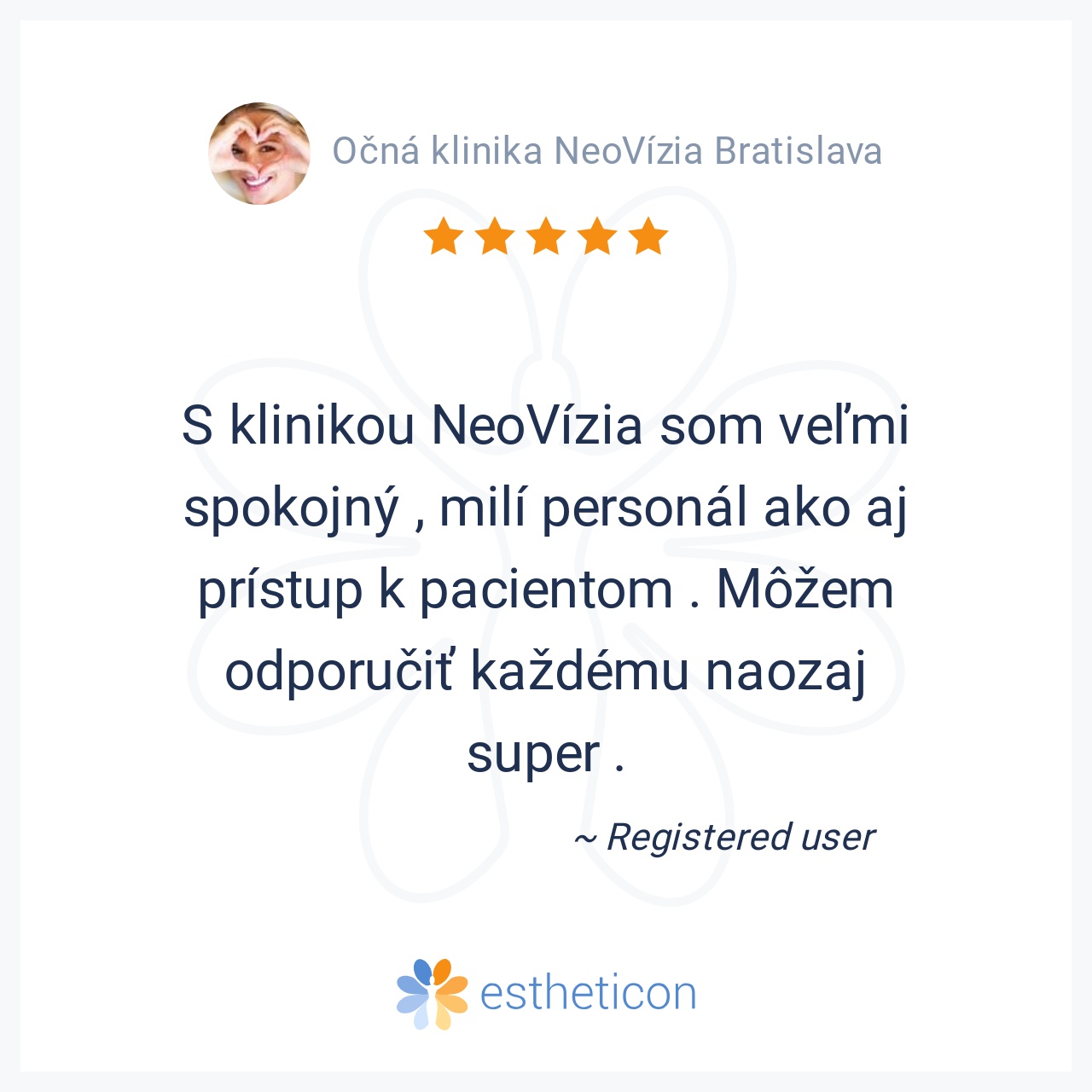S klinikou NeoVízia som veľmi spokojný , milí personál ako aj prístup k pacientom . Môžem odporučiť každému naozaj super .