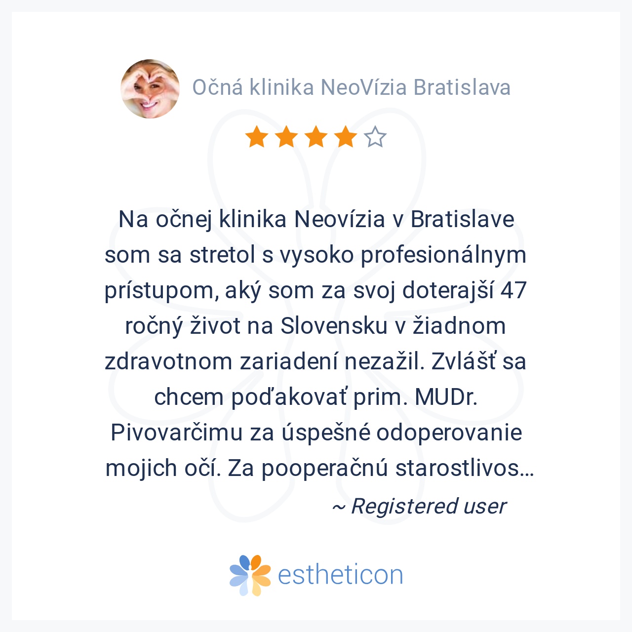 Na očnej klinika Neovízia v Bratislave som sa stretol s vysoko profesionálnym prístupom, aký som za svoj doterajší 47 ročný život na Slovensku v žiadnom zdravotnom zariadení nezažil. Zvlášť sa chcem poďakovať prim. MUDr.... Viac
