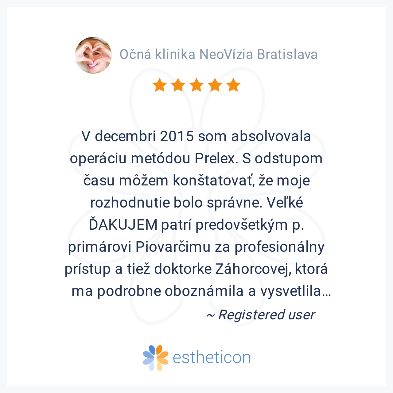 Po vyšetreniach na klinike NeoVízia mi pani doktorka Smorádková povedala ,že vidím len na 5 percent.Po konztultácii mi odporučila operáciu metódou PRELEX.Operoval ma pán primár Piovarči.Som po operácii viac ako tri mesia... Viac
