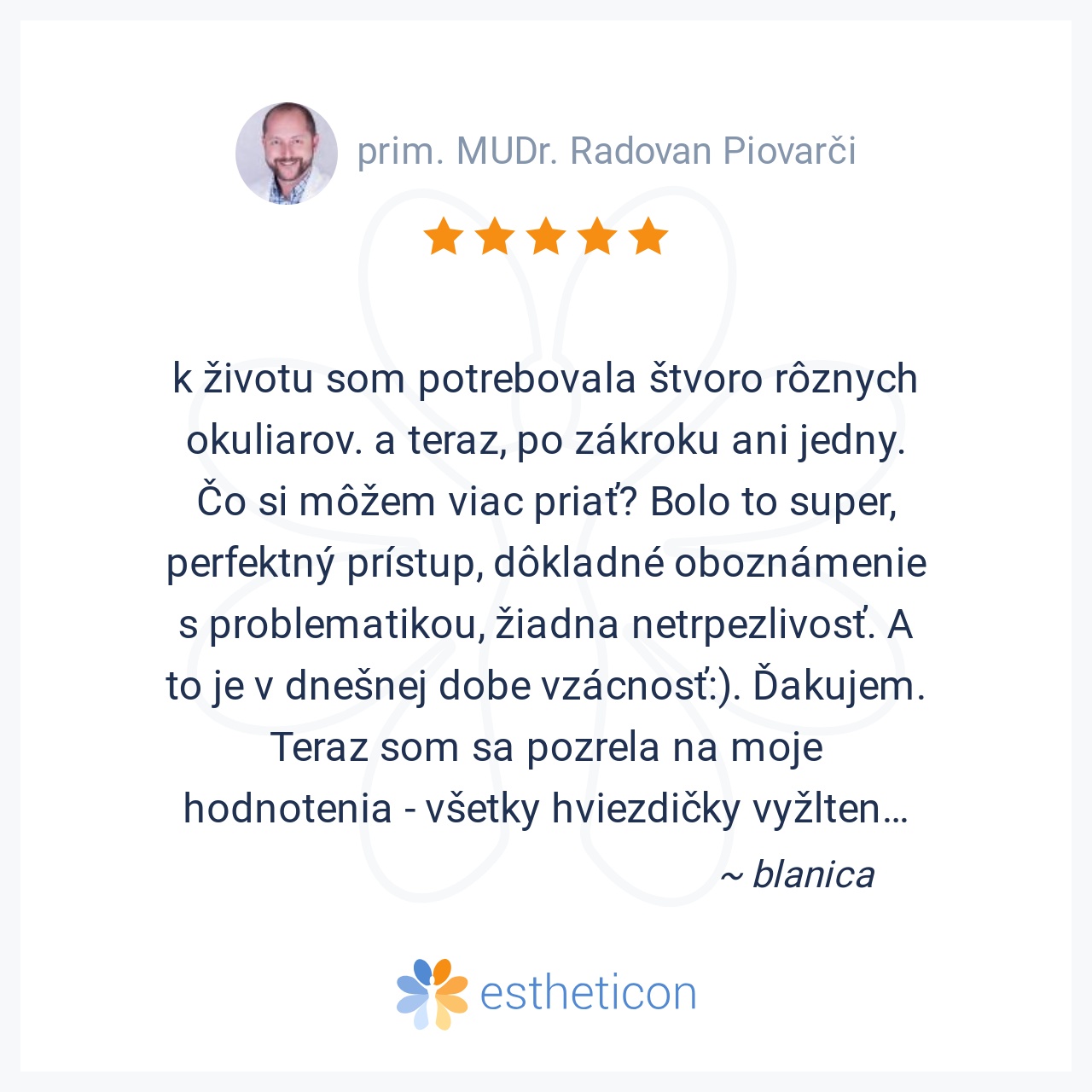 V decembri 2015 som absolvovala operáciu metódou Prelex. S odstupom času môžem konštatovať, že moje rozhodnutie bolo správne. Veľké ĎAKUJEM patrí predovšetkým p. primárovi Piovarčimu za profesionálny prístup a tiež dokto... Viac