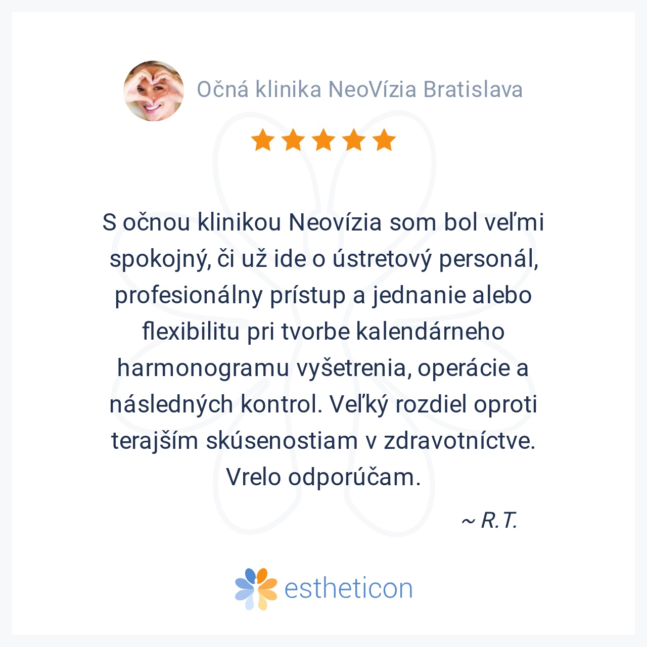 S očnou klinikou Neovízia som bol veľmi spokojný, či už ide o ústretový personál, profesionálny prístup a jednanie alebo flexibilitu pri tvorbe kalendárneho harmonogramu vyšetrenia, operácie a následných kontrol. Veľký r... Viac