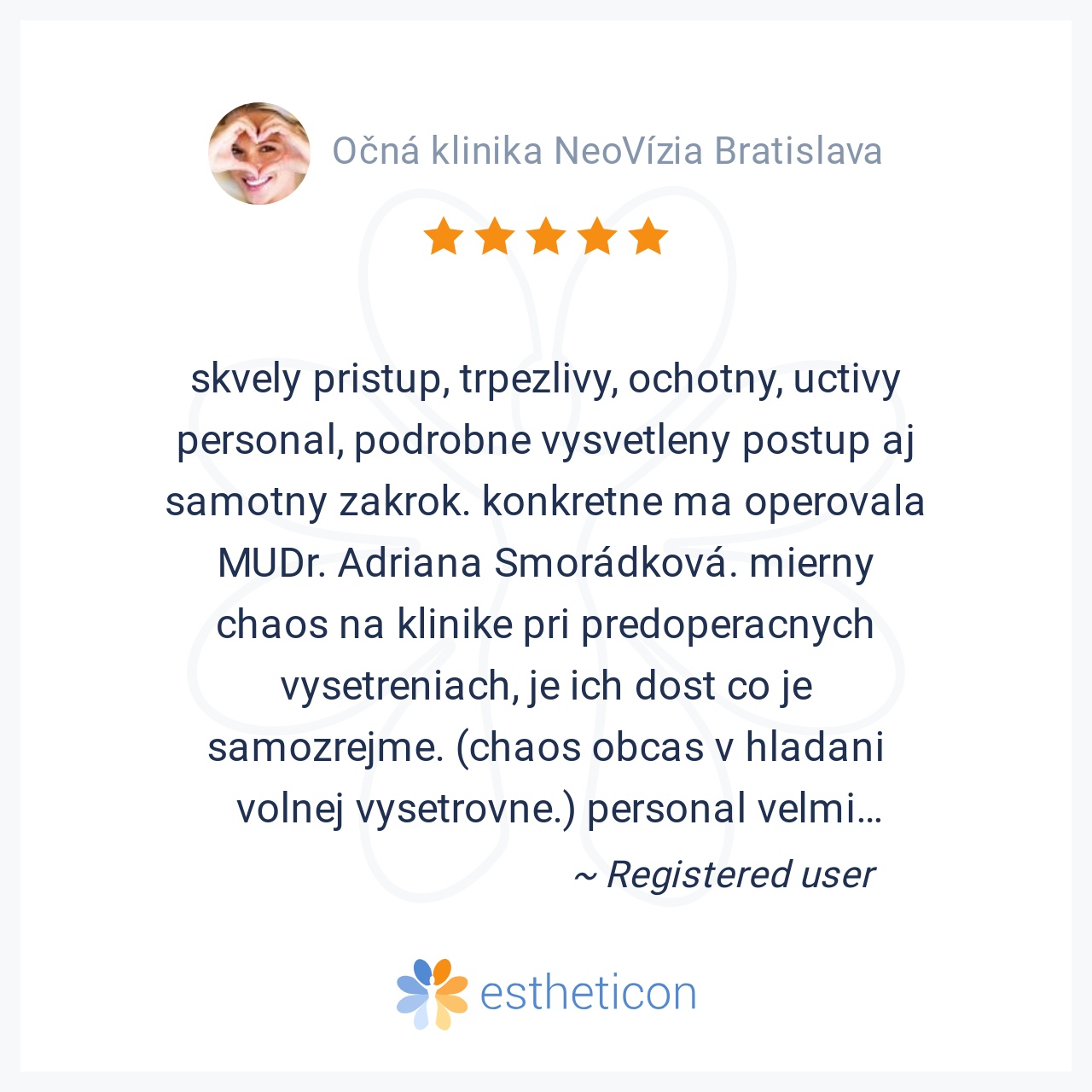 Očnú kliniku Neovízia hodnotím ako najlepšiu očnú kliniku na území SR, perfektný a ústretový kolektív sestričiek a lekárov. Zmenili mi život o 180 stupňov s úsmevom na tvári a bez bolestí. Odporúčam veľmi.