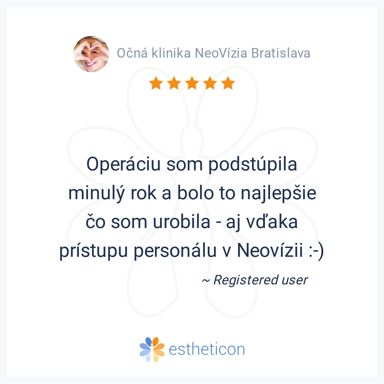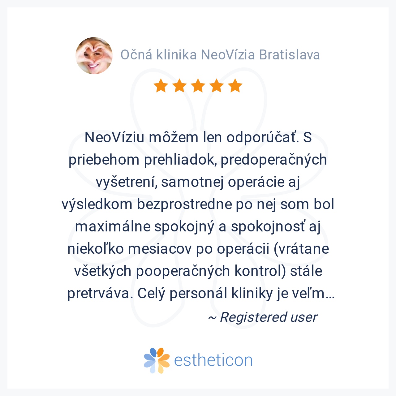 NeoVíziu môžem len odporúčať. S priebehom prehliadok, predoperačných vyšetrení, samotnej operácie aj výsledkom bezprostredne po nej som bol maximálne spokojný a spokojnosť aj niekoľko mesiacov po operácii (vrátane všetký... Viac