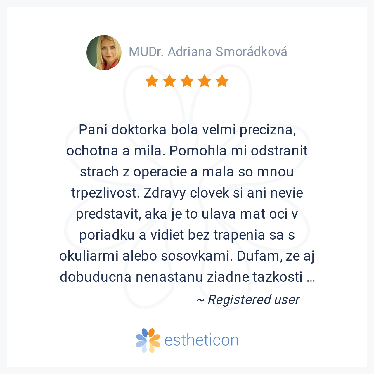 Pani doktorka bola velmi precizna, ochotna a mila. Pomohla mi odstranit strach z operacie a mala so mnou trpezlivost. Zdravy clovek si ani nevie predstavit, aka je to ulava mat oci v poriadku a vidiet bez trapenia sa s o... Viac