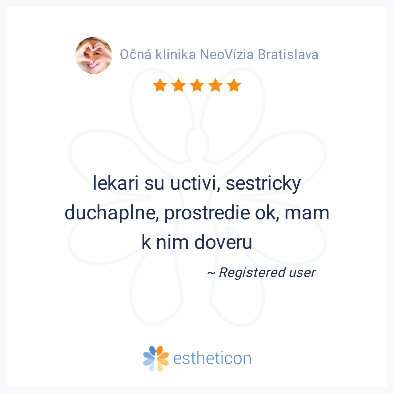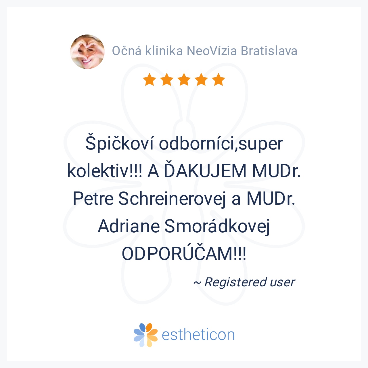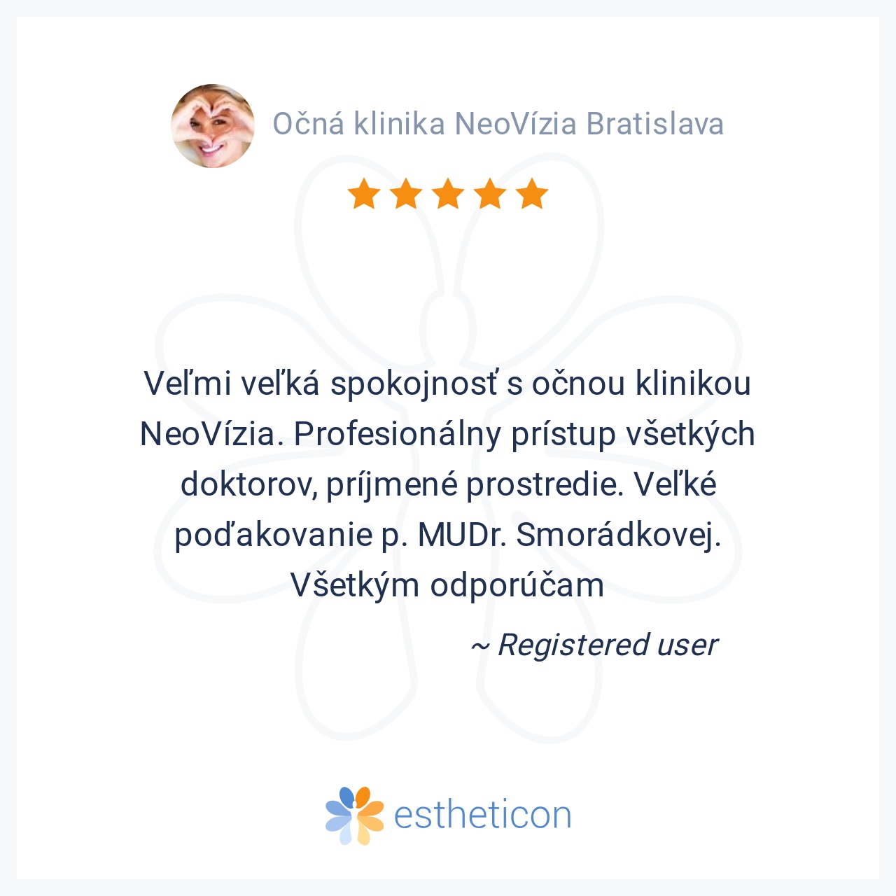 Veľmi veľká spokojnosť s očnou klinikou NeoVízia. Profesionálny prístup všetkých doktorov, príjmené prostredie. Veľké poďakovanie p. MUDr. Smorádkovej. Všetkým odporúčam
