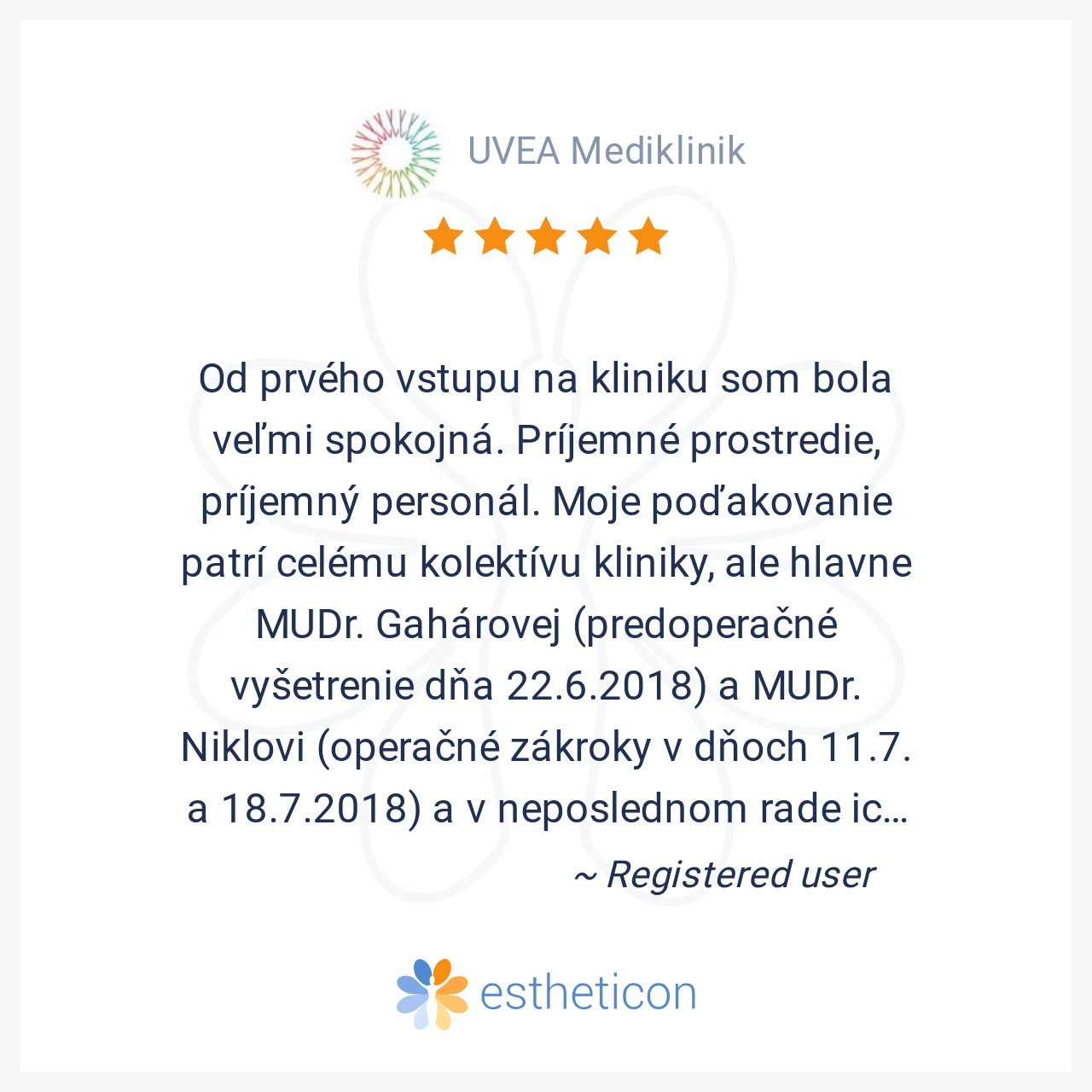 Od prvého vstupu na kliniku som bola veľmi spokojná. Príjemné prostredie, príjemný personál. Moje poďakovanie patrí celému kolektívu kliniky, ale hlavne MUDr. Gahárovej (predoperačné vyšetrenie dňa 22.6.2018) a MUDr. Nik... Viac