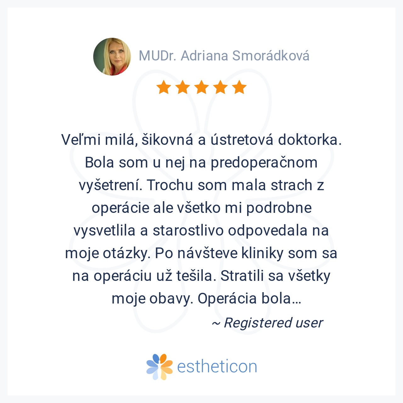 Veľmi milá, šikovná a ústretová doktorka. Bola som u nej na predoperačnom vyšetrení. Trochu som mala strach z operácie ale všetko mi podrobne vysvetlila a starostlivo odpovedala na moje otázky. Po návšteve kliniky som sa... Viac