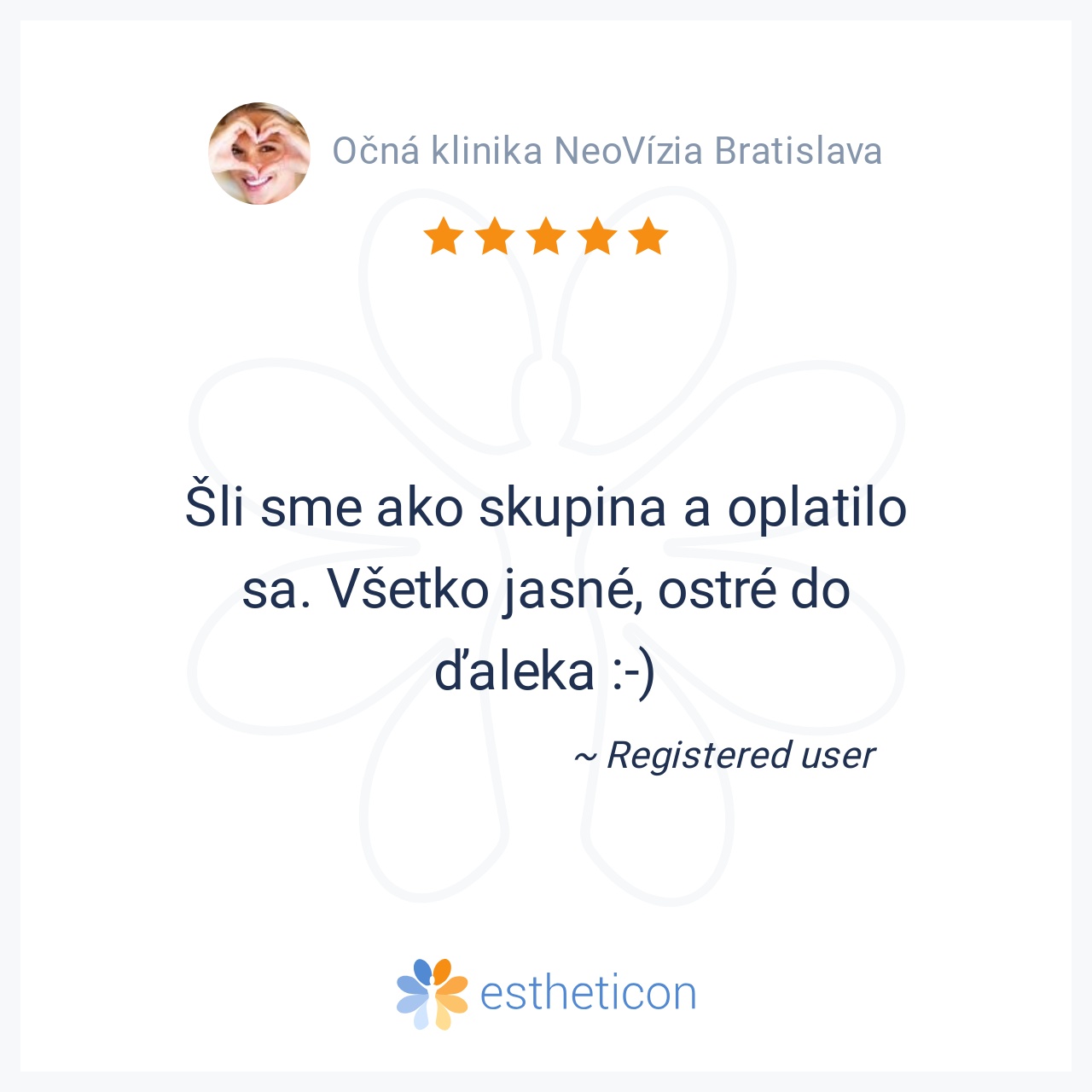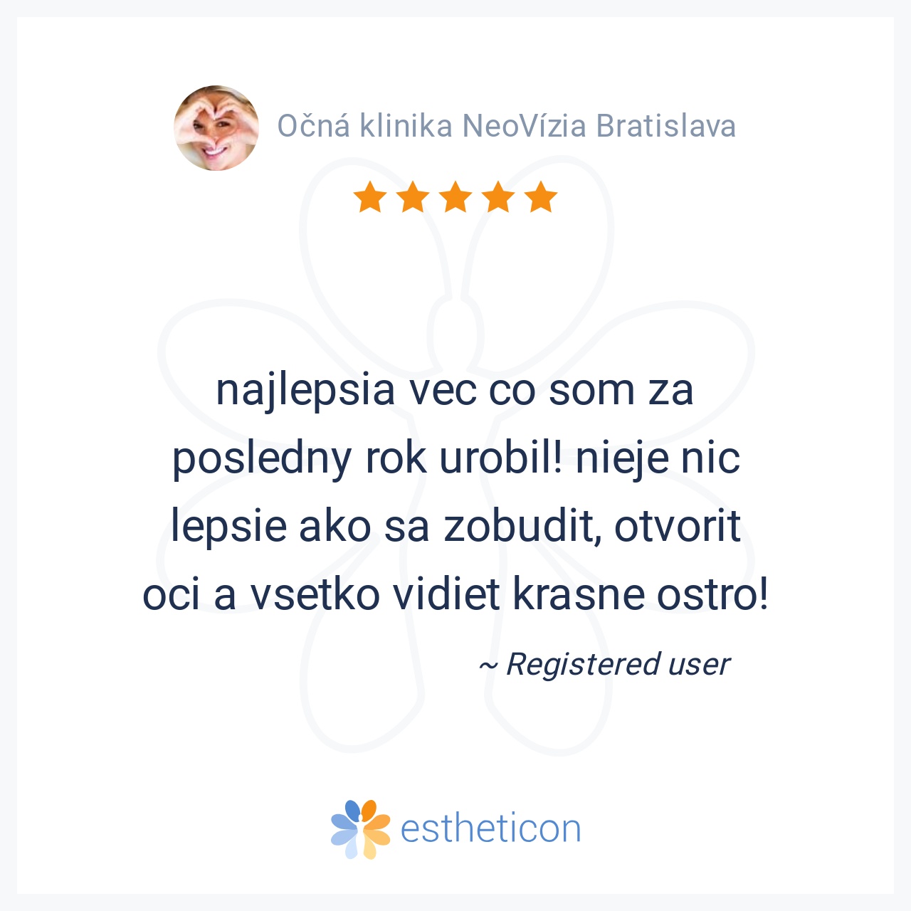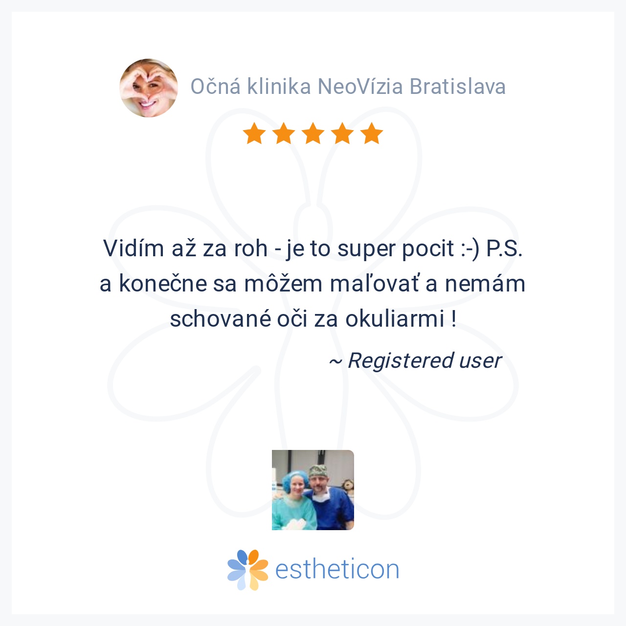 Očnú kliniku Neovízia hodnotím ako najlepšiu na území SR. zmenili mi život a pohľad na svet o 180 stupňov, perfektný kolektív lekárov a sestričiek.