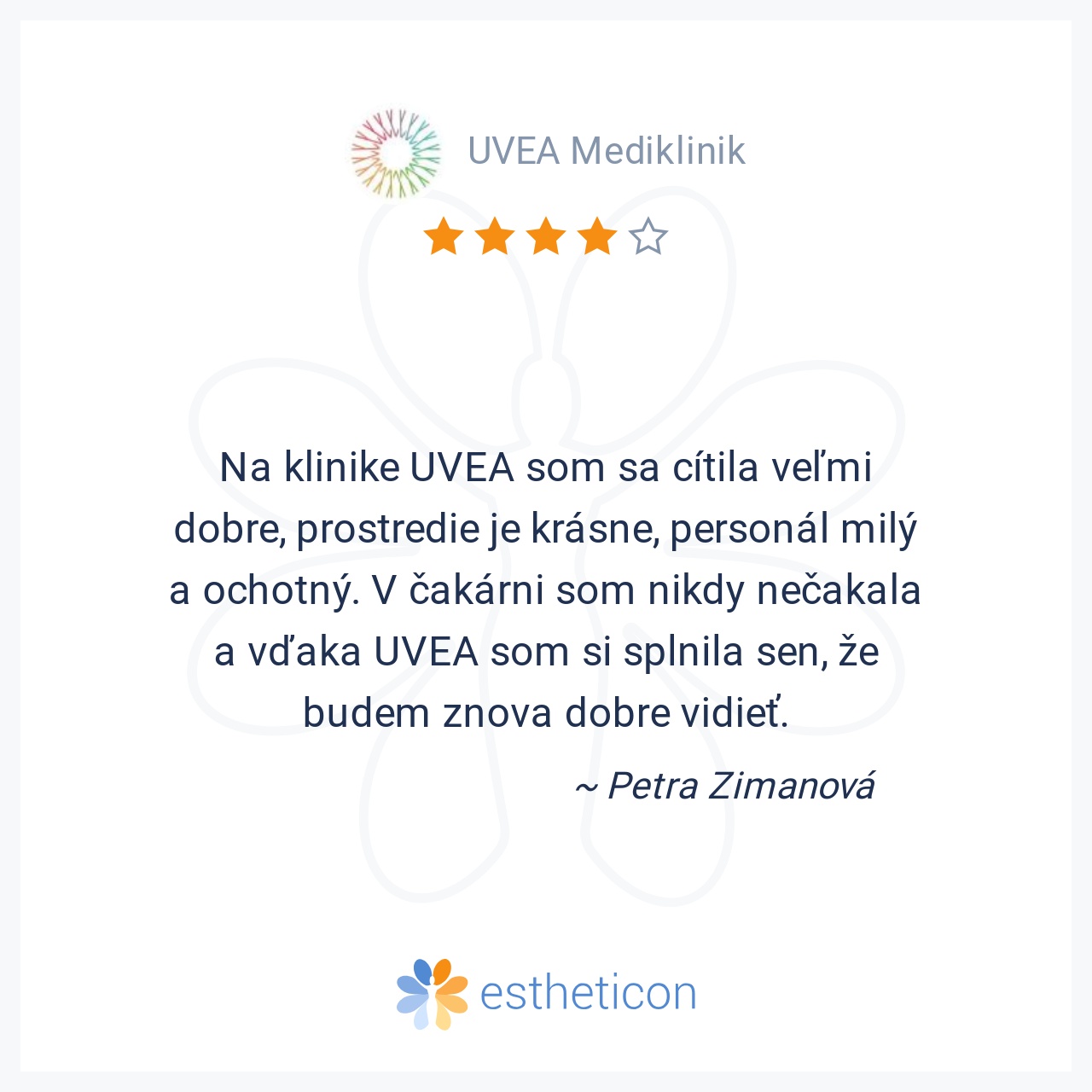 Na klinike UVEA som sa cítila veľmi dobre, prostredie je krásne, personál milý a ochotný. V čakárni som nikdy nečakala a vďaka UVEA som si splnila sen, že budem znova dobre vidieť.