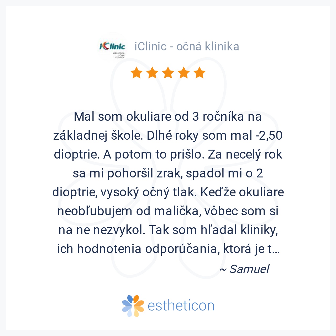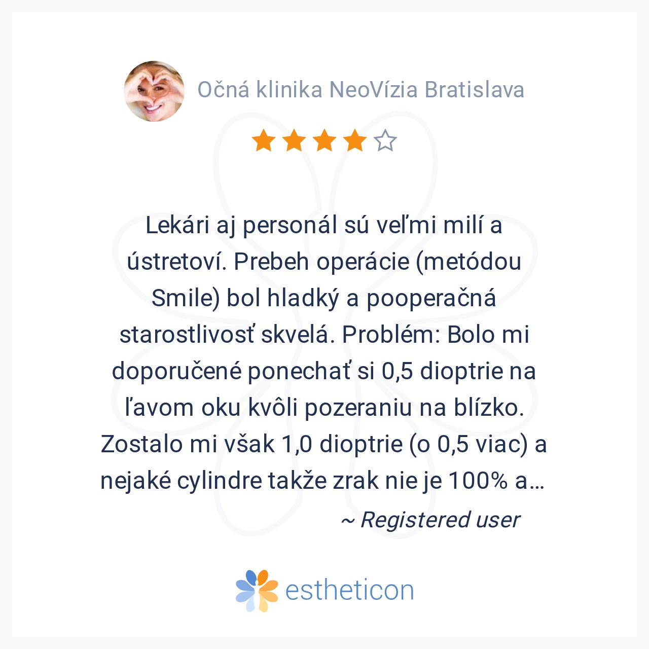 Lekári aj personál sú veľmi milí a ústretoví. Prebeh operácie (metódou Smile) bol hladký a pooperačná starostlivosť skvelá. Problém: Bolo mi doporučené ponechať si 0,5 dioptrie na ľavom oku kvôli pozeraniu na blízko. Zos... Viac
