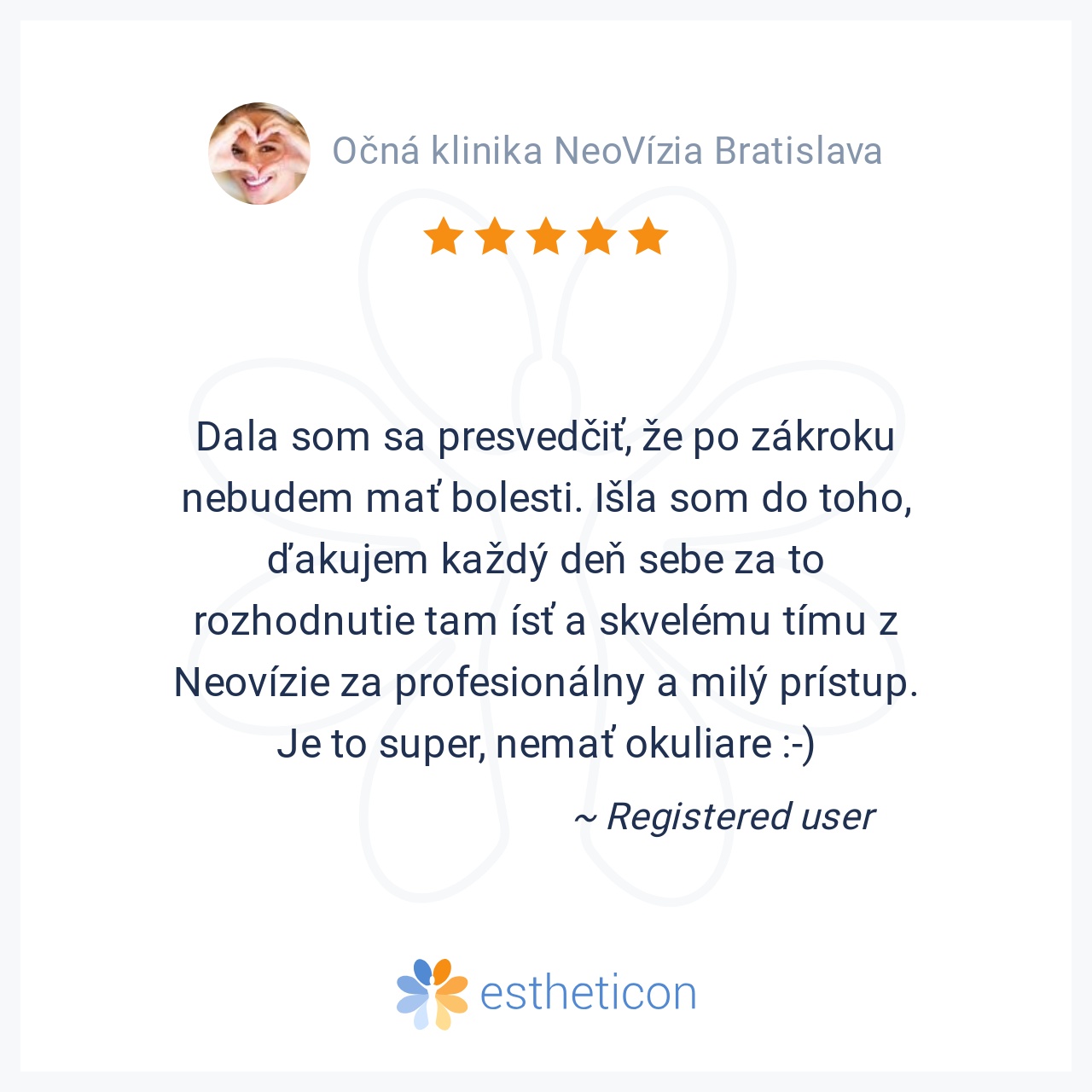 Dala som sa presvedčiť, že po zákroku nebudem mať bolesti. Išla som do toho, ďakujem každý deň sebe za to rozhodnutie tam ísť a skvelému tímu z Neovízie za profesionálny a milý prístup. Je to super, nemať okuliare :-)