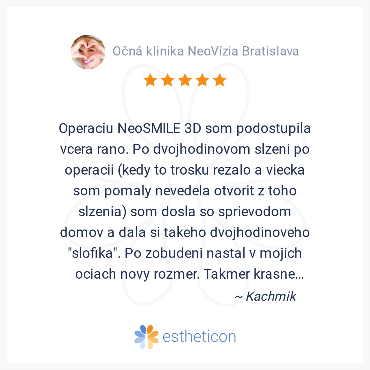 Pri 7mich dioptriach som sa rozhodla navstivit kliniku neovizia. Po velmi dokladnom vysetreni mi bol dany termin zakroku. Som 5 dni po zakroku a citim sa uzasne. Videla som vlastne okamzite po operacii a bolo to neuverit... Viac