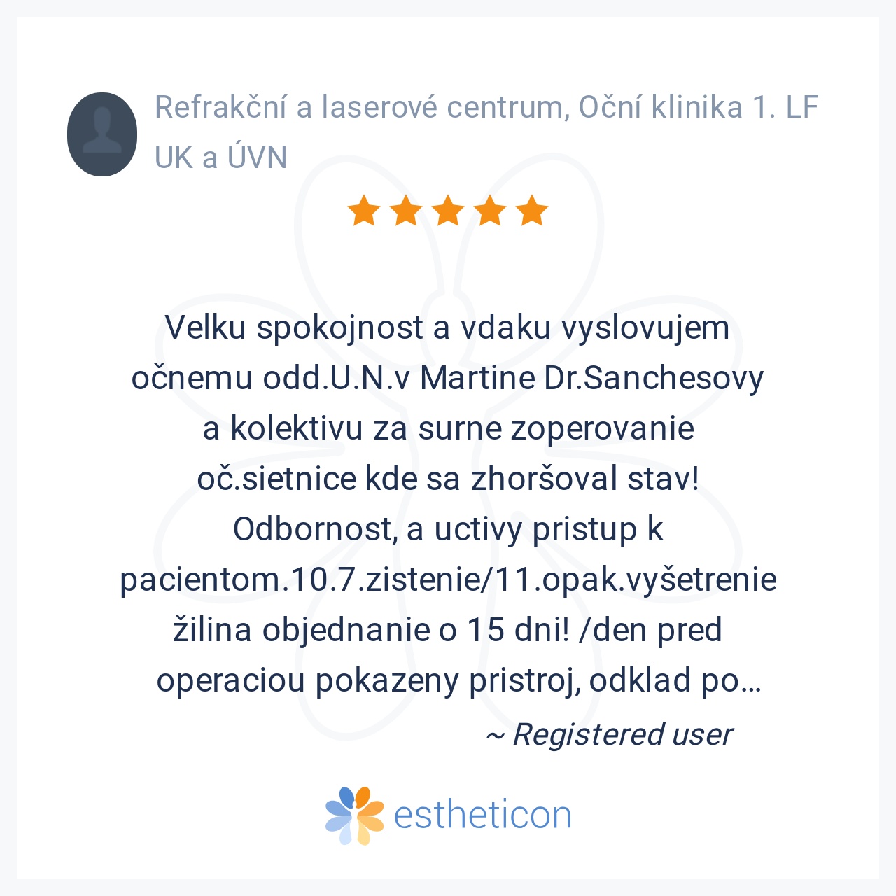 Velku spokojnost a vdaku vyslovujem očnemu odd.U.N.v Martine Dr.Sanchesovy a kolektivu za surne zoperovanie oč.sietnice kde sa zhoršoval stav! Odbornost, a uctivy pristup k pacientom.10.7.zistenie/11.opak.vyšetrenie žili... Viac