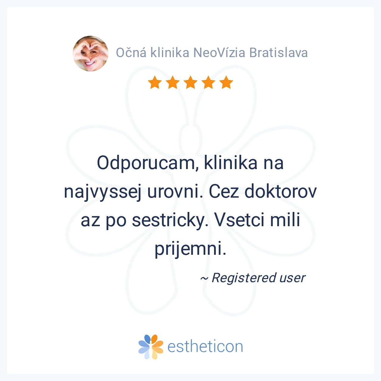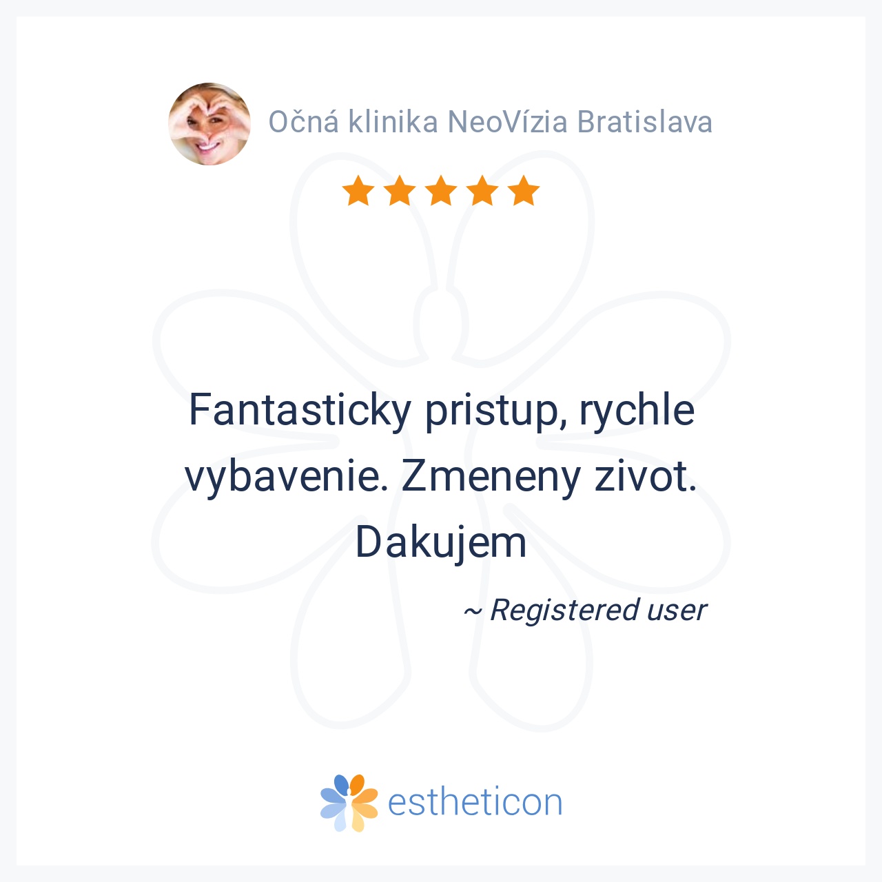 Ďakujem veľmi pekne p. primárovi MUDr. Piovačimu, p. MUDr. Belinskej a p. MUDr. Drmotovi za moje "nové videnie". Po 29 rokoch som sa zbavila okuliarov, čo považujem za zázrak.Kliniku Neovízia Bratislava vrelo odporúčam.