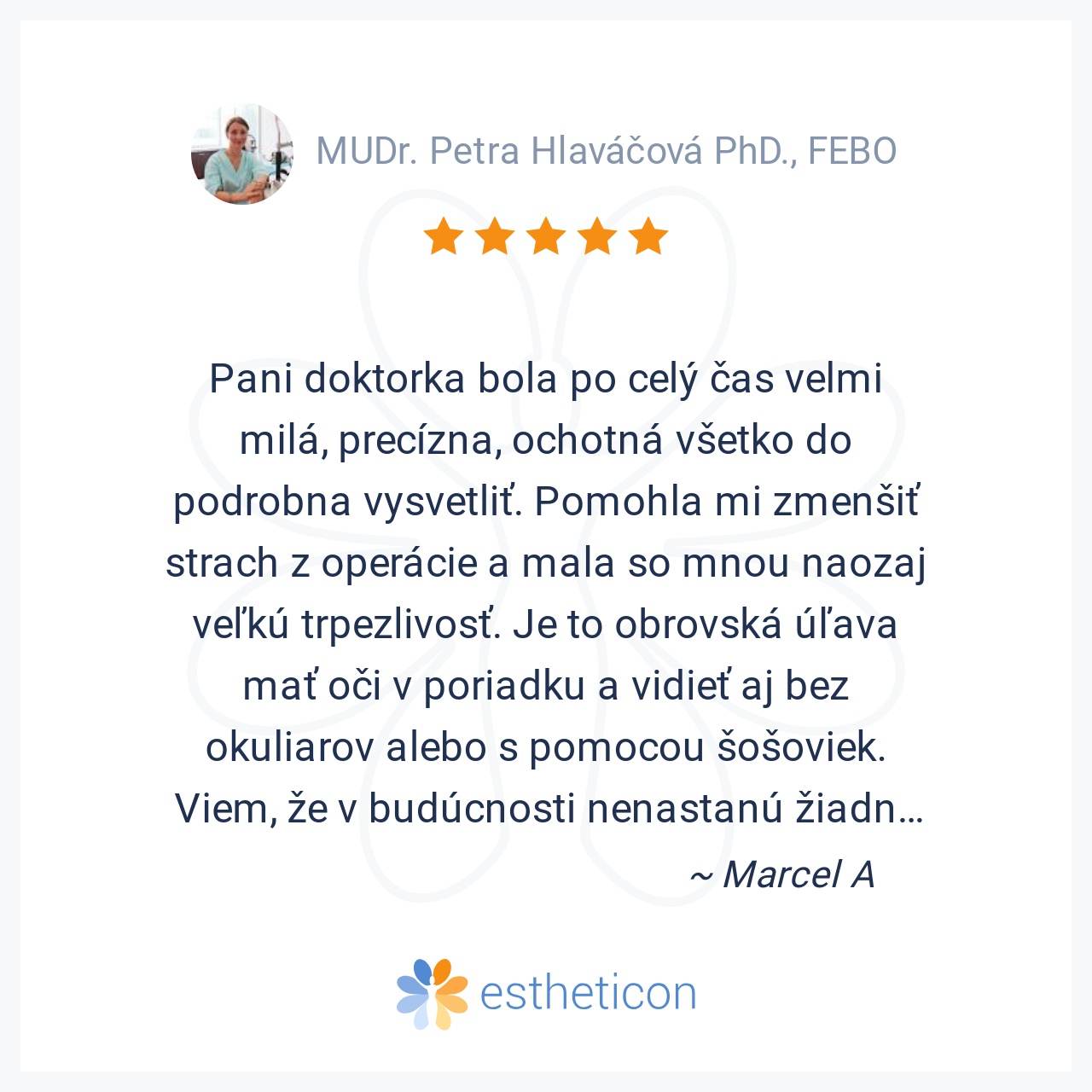 Pani doktorka bola po celý čas velmi milá, precízna, ochotná všetko do podrobna vysvetliť. Pomohla mi zmenšiť strach z operácie a mala so mnou naozaj veľkú trpezlivosť. Je to obrovská úľava mať oči v poriadku a vidieť aj... Viac