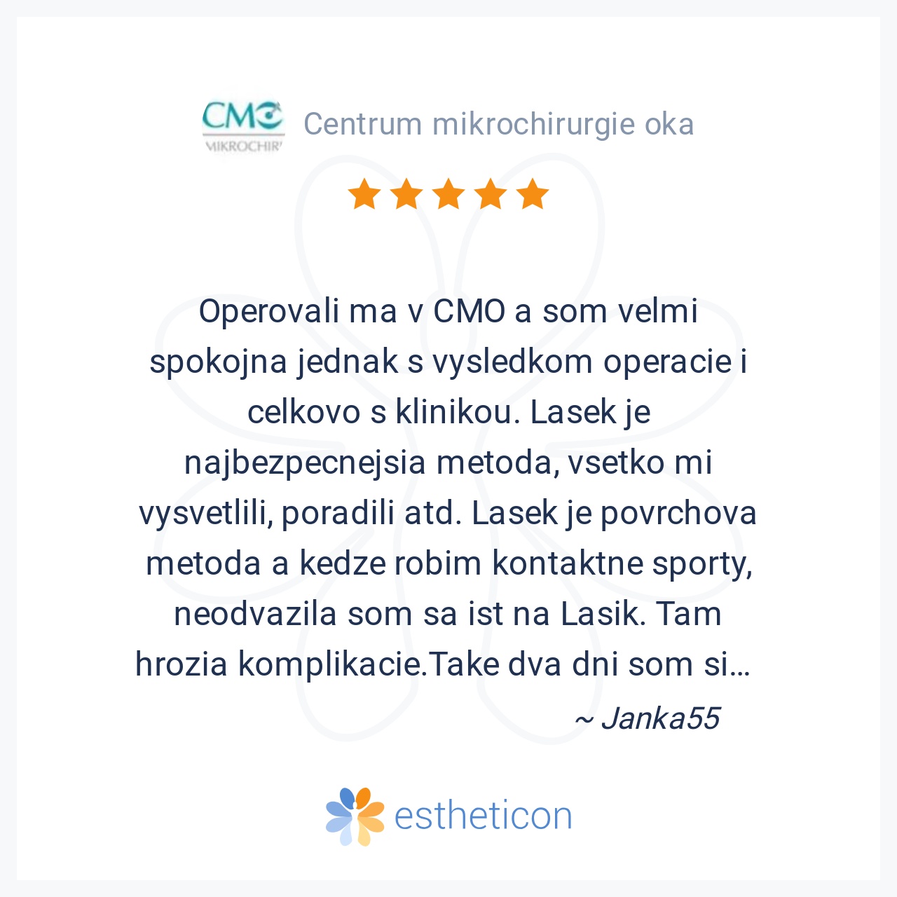 Operovali ma v CMO a som velmi spokojna jednak s vysledkom operacie i celkovo s klinikou. Lasek je najbezpecnejsia metoda, vsetko mi vysvetlili, poradili atd. Lasek je povrchova metoda a kedze robim kontak... Viac