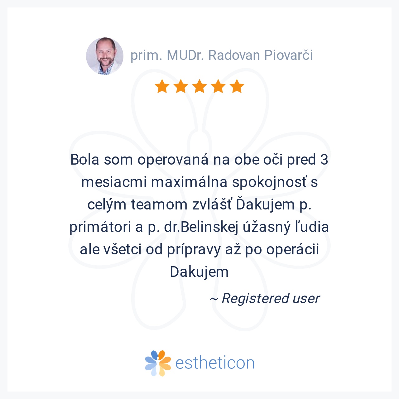 Bola som operovaná na obe oči pred 3 mesiacmi maximálna spokojnosť s celým teamom zvlášť Ďakujem p. primátori a p. dr.Belinskej úžasný ľudia ale všetci od prípravy až po operácii Dakujem