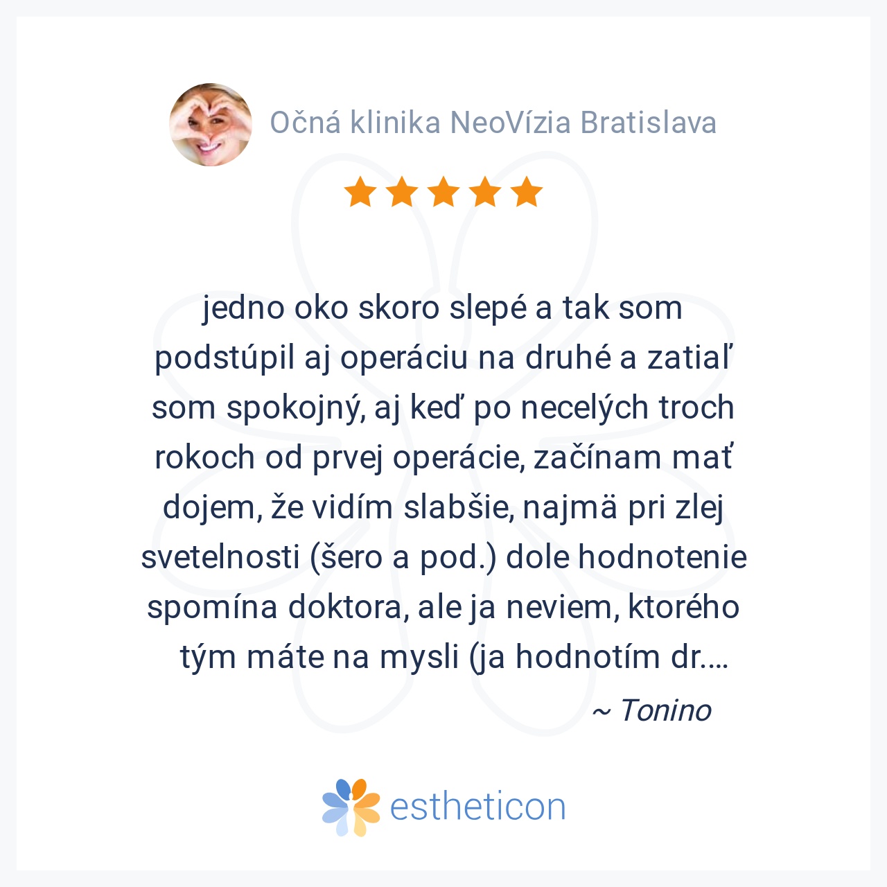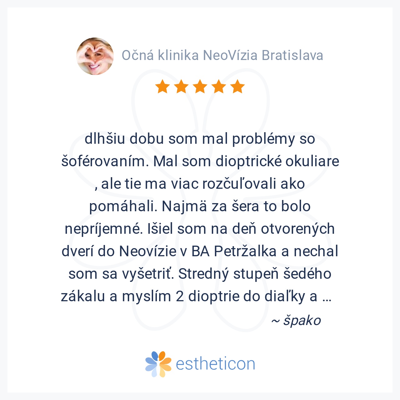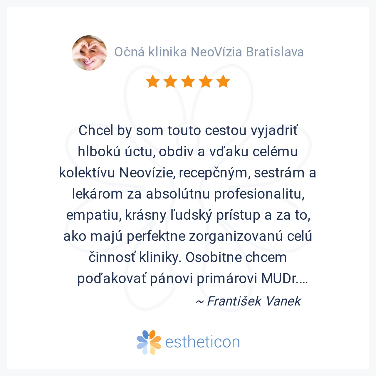 Chcel by som touto cestou vyjadriť hlbokú úctu, obdiv a vďaku celému kolektívu Neovízie, recepčným, sestrám a lekárom za absolútnu profesionalitu, empatiu, krásny ľudský prístup a za to, ako majú perfektne zorganizovanú ... Viac