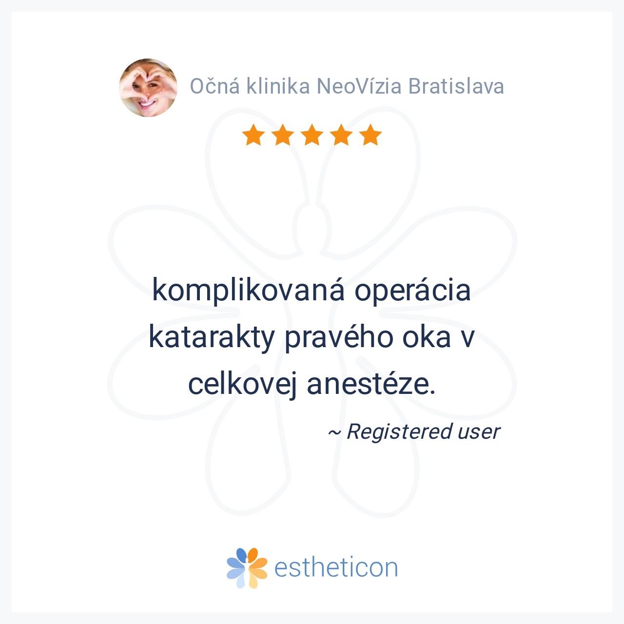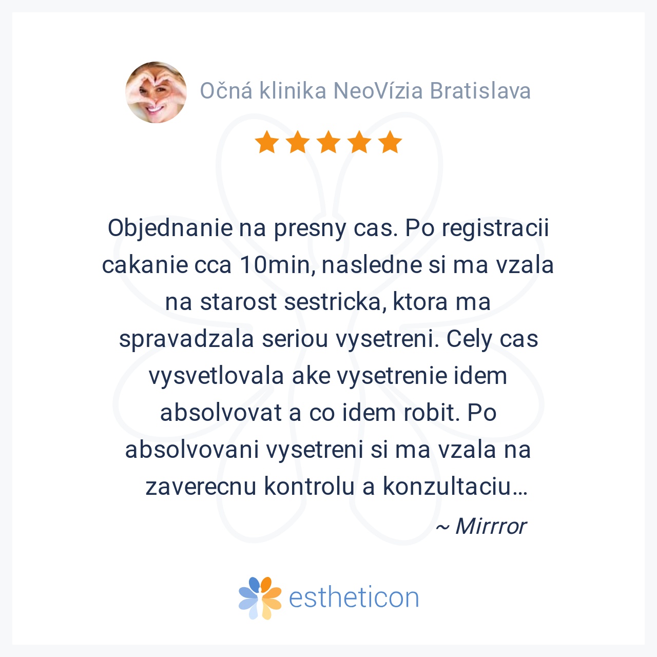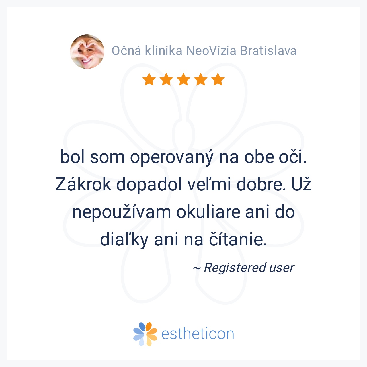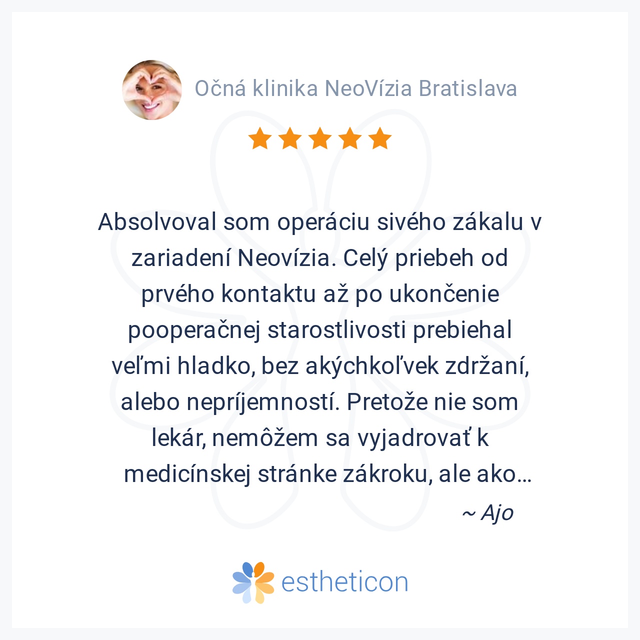 Chcel by som touto cestou vyjadriť hlbokú úctu, obdiv a vďaku celému kolektívu Neovízie, recepčným, sestrám a lekárom za absolútnu profesionalitu, empatiu, krásny ľudský prístup a za to, ako majú perfektne zorganizovanú ... Viac