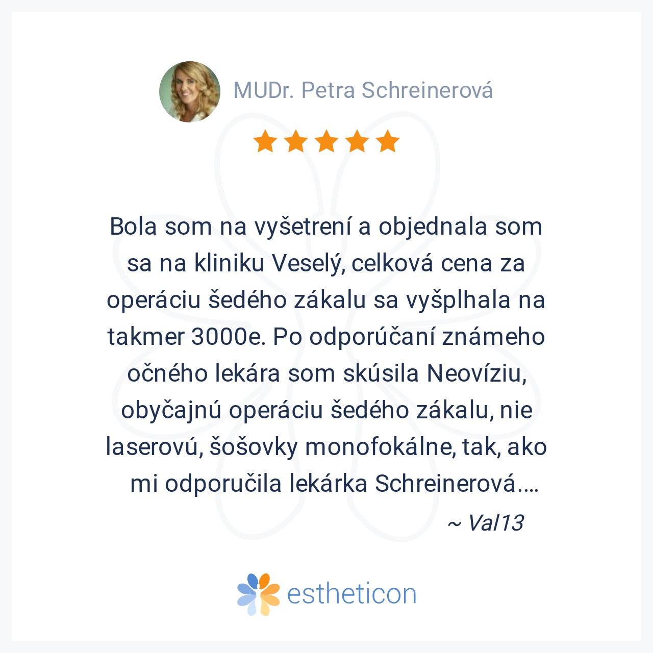 Od prvého vstupu na očnú kliniku, som prežila veľmi príjemný pocit a spokojnosť s celým zdravotníckym personálom, s ktorým som prišla do styku. Od e-mailovej komunikácie, recepcii, zdravotnej sestry Marcelky Pospíšilovej... Viac