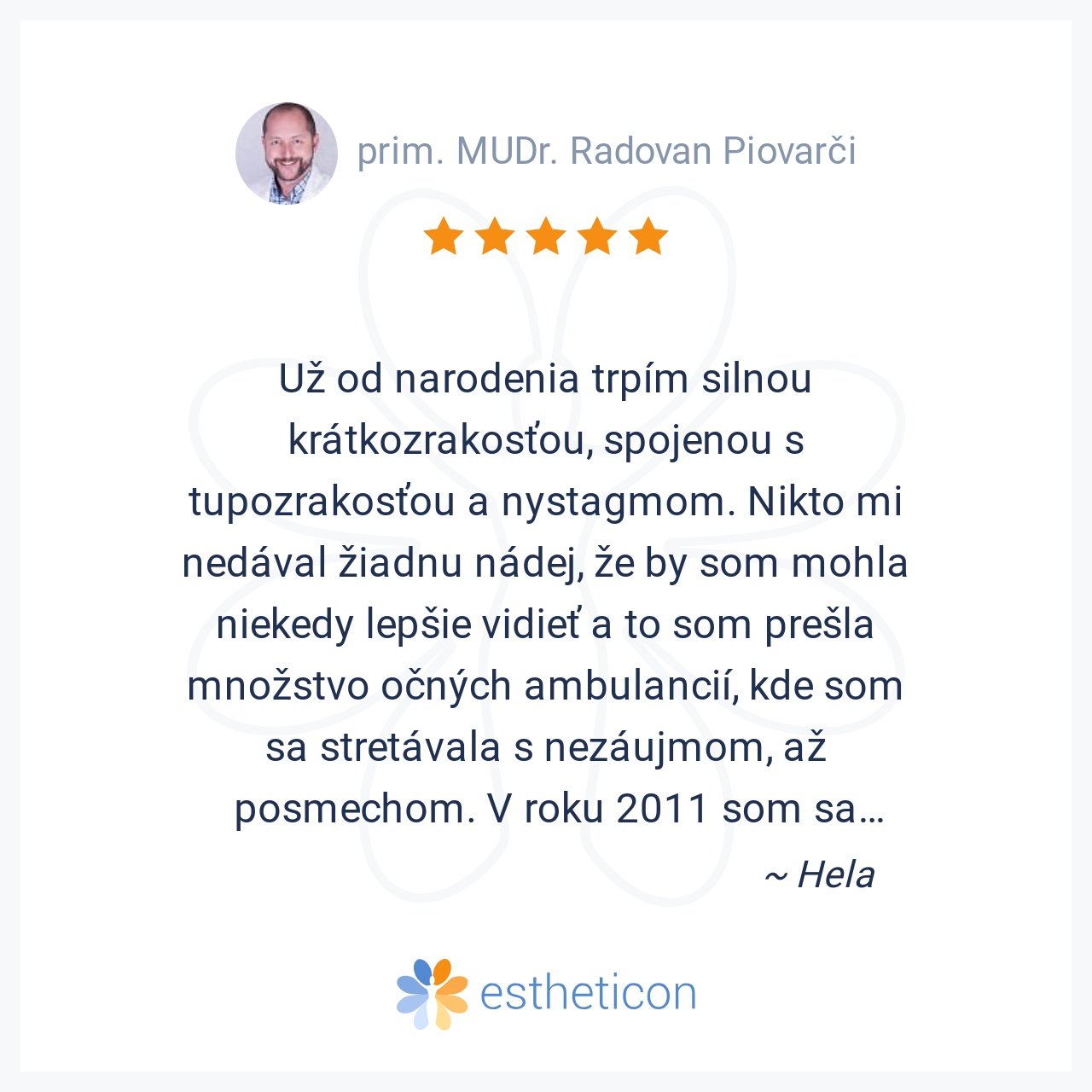 So zákrokom, prístupom a výsledkom operácie /odstránenie šedého zákalu/ som veľmi spokojný. Nikdy som tak dobre nevidel, ako po odbornom a profesionálnom odstránení š. zákalu, ktorý mi veľmi nepríjemne zhoršoval videnie.... Viac