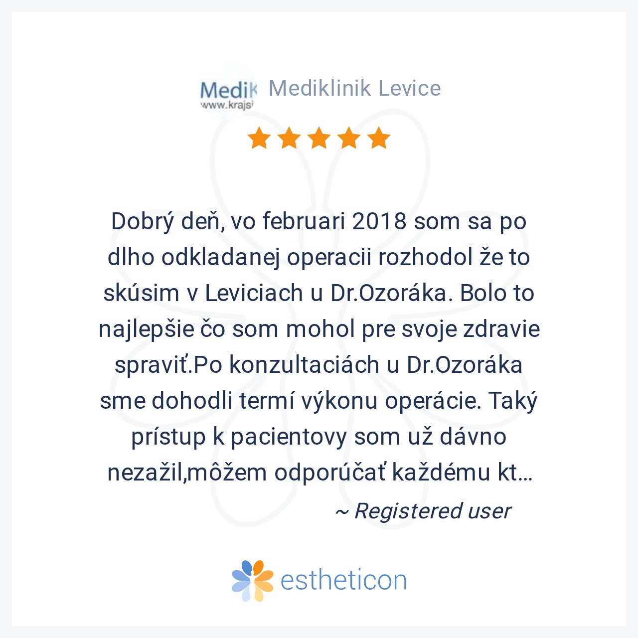Dobrý deň, vo februari 2018 som sa po dlho odkladanej operacii rozhodol že to skúsim v Leviciach u Dr.Ozoráka. Bolo to najlepšie čo som mohol pre svoje zdravie spraviť.Po konzultaciách u Dr.Ozoráka sme dohodli termí výko... Viac