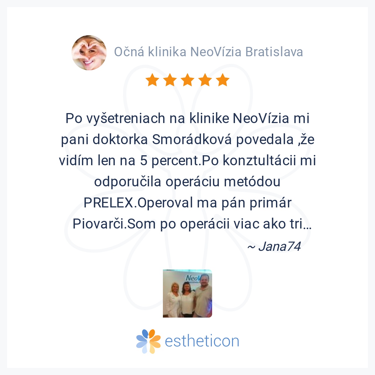 Po vyšetreniach na klinike NeoVízia mi pani doktorka Smorádková povedala ,že vidím len na 5 percent.Po konztultácii mi odporučila operáciu metódou PRELEX.Operoval ma pán primár Piovarči.Som po operácii viac ako tri mesiace a VIDÍIIM perfektne.Moje veľké ďakujem !!!