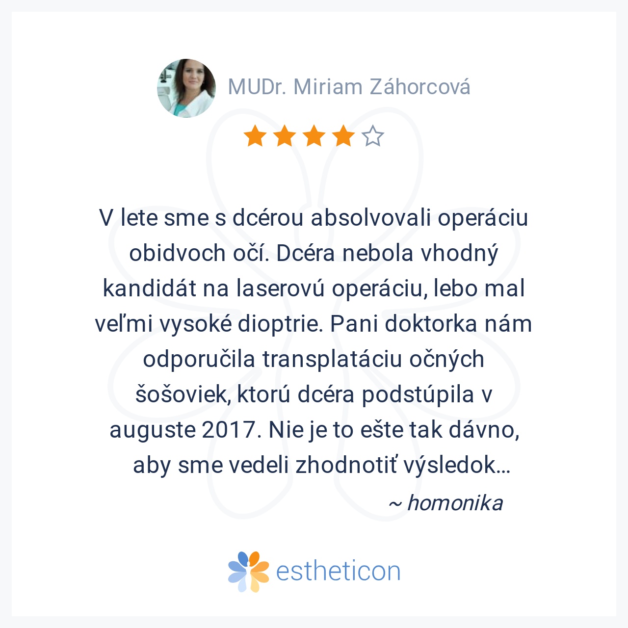 V lete sme s dcérou absolvovali operáciu obidvoch očí. Dcéra nebola vhodný kandidát na laserovú operáciu, lebo mal veľmi vysoké dioptrie. Pani doktorka nám odporučila transplatáciu očných šošoviek, ktorú dcéra podstúpila v auguste 2017. Nie je to ešte tak dávno, aby sme vedeli zhodnotiť výsledok operácie z dlhodobého hľadiska, ale po mesačnej kontrole mala dcéra z medicínskeho hľadiska nulové dioptrie. Teraz vôbec nenosí okuliare, vidí dobre len sem tam má zablesky pri pozeraní do svetla, čo by však malo časom úplne ustúpiť, je spokojná a nesťažuje sa ani na bolesti. V septembri nastúpila na štúdium architektúry, čo je dosť náročné aj pre jej zrak, tak dúfame, že to lepšie zvládne aj za pomoci tejto operácie.