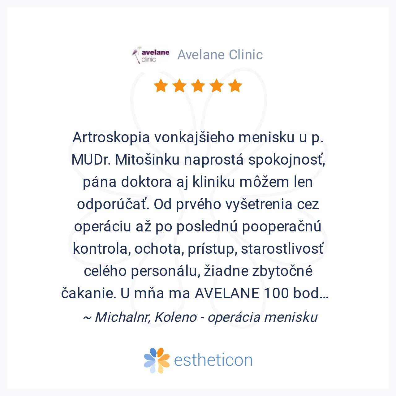 naprostá spokojnosť, pána doktora aj kliniku môžem len odporúčať. Od prvého vyšetrenia cez operáciu až po poslednú pooperačnú kontrola, ochota, prístup, starostlivosť celého personálu, žiadne zbytočné čakanie.