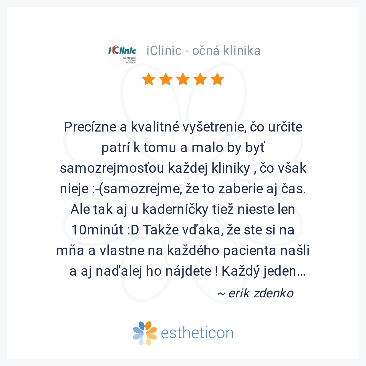 Precízne a kvalitné vyšetrenie, čo určite patrí k tomu a malo by byť samozrejmosťou každej kliniky , čo však nieje :-(samozrejme, že to zaberie aj čas. Ale tak aj u kaderníčky tiež nieste len 10minút :D Takže vďaka, že ste si na mňa a vlastne na každého pacienta našli a aj naďalej ho nájdete ! Každý jeden lekár je špecialista a príjemným vystupovaním. Zrak máme len jeden, preto treba si dať záležať na výbere kliniky, ktorej zveríte oči do ich rúk.