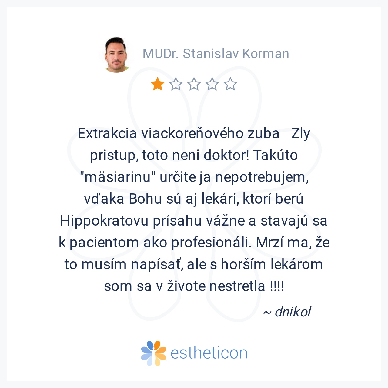 Extrakcia viackoreňového zuba Zly pristup, toto neni doktor! Takúto "mäsiarinu" určite ja nepotrebujem, vďaka Bohu sú aj lekári, ktorí berú Hippokratovu prísahu vážne a stavajú sa k pacientom ako profesionáli. Mrzí ma,... Viac