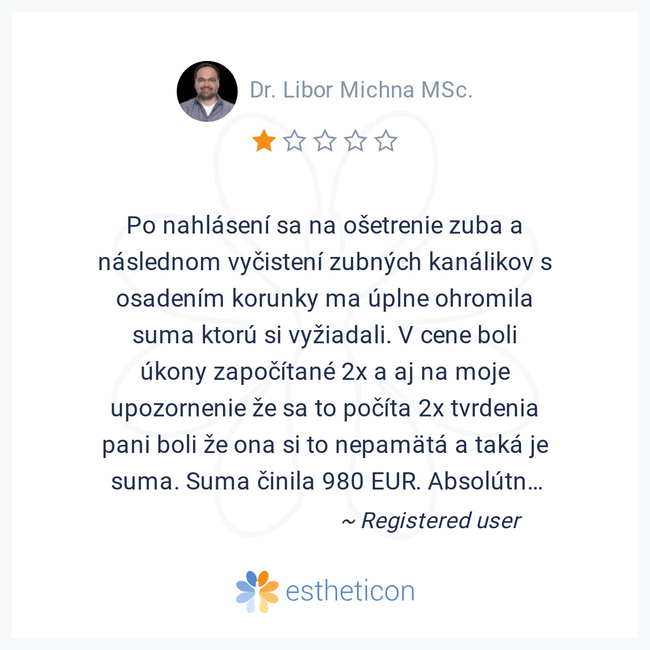 Po nahlásení sa na ošetrenie zuba a následnom vyčistení zubných kanálikov s osadením korunky ma úplne ohromila suma ktorú si vyžiadali. V cene boli úkony započítané 2x a aj na moje upozornenie že sa to počíta 2x tvrdenia... Viac